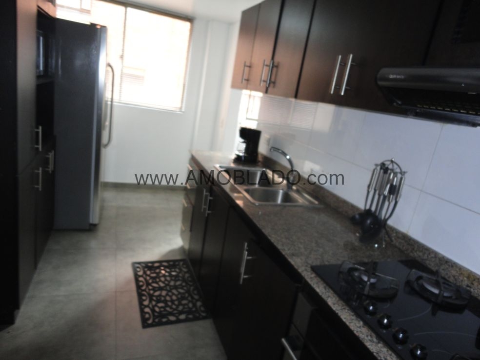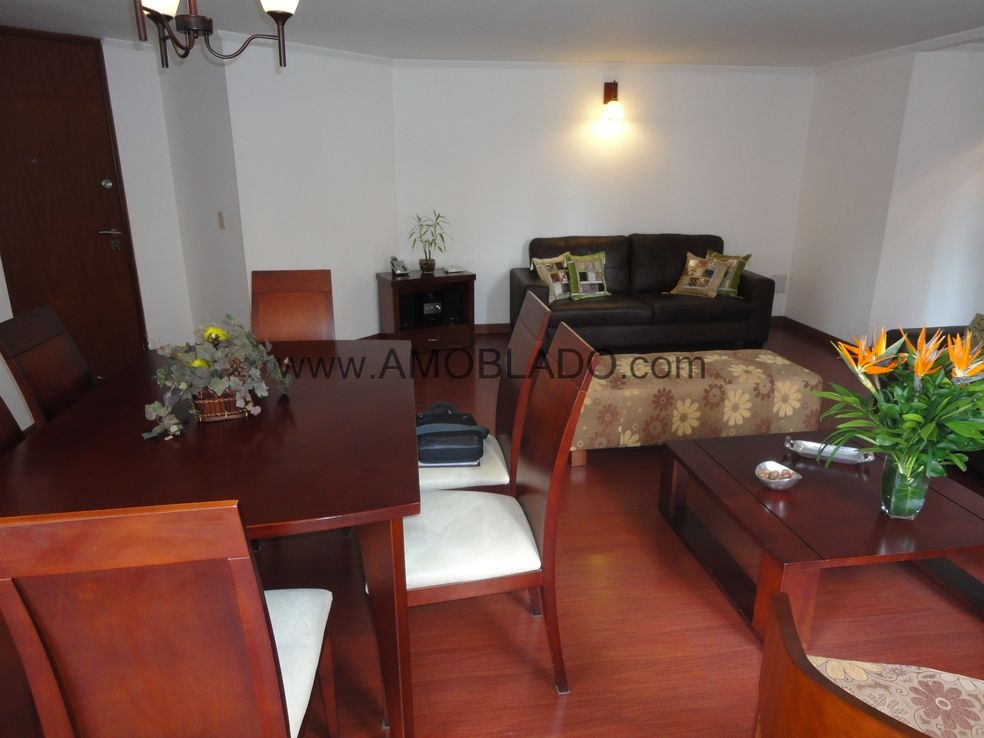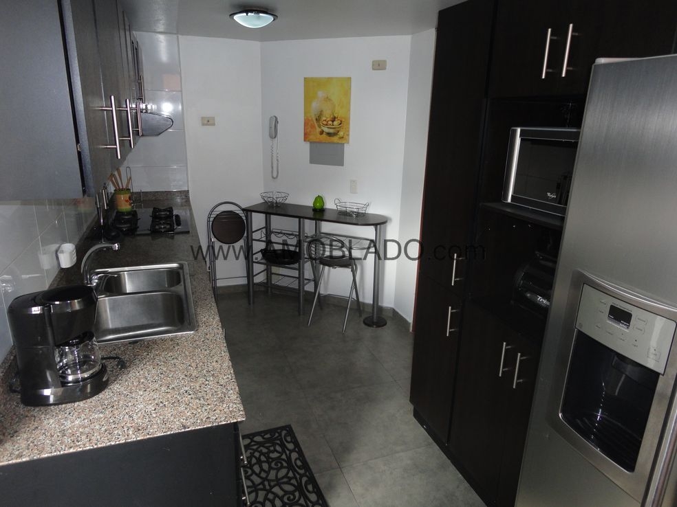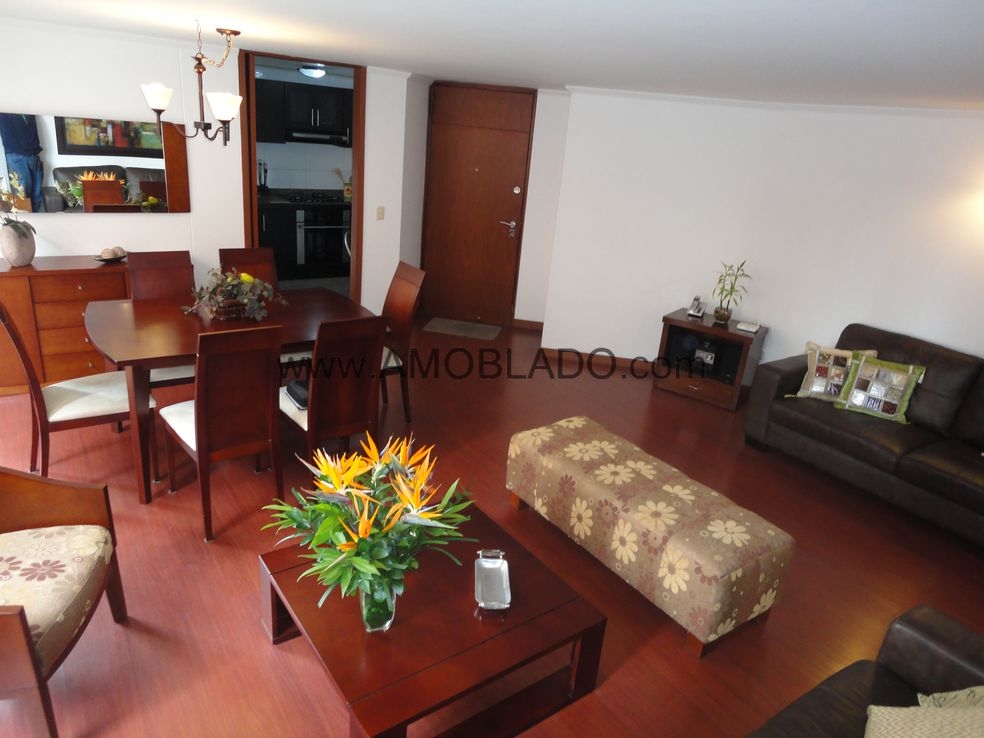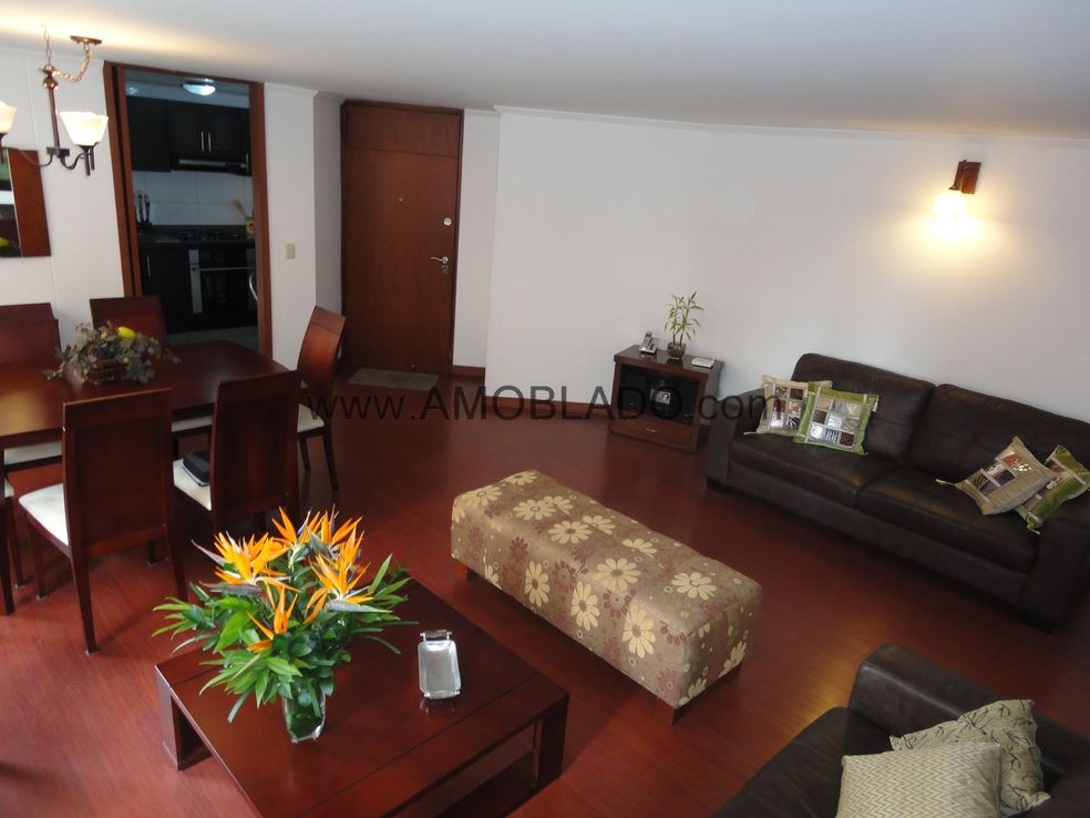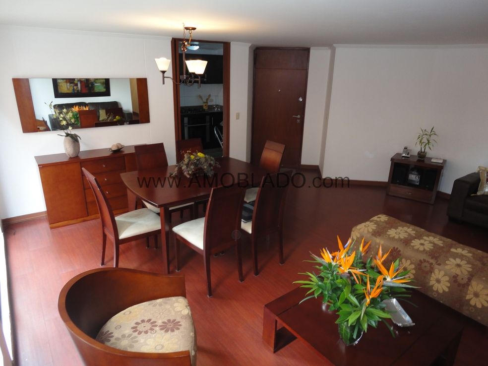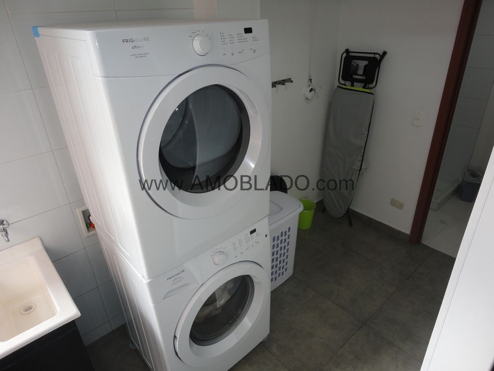 El apartamento tiene un área aproximada de 120 metros cuadrados, consta de tres alcobas, tres baños, zona social con chimenea y comedor tradicional de 6 puestos y balcón en el mismo ambiente. La cocina es integral independiente, muy clara y ventilada con espacio de lavandería. Tiene lavadora y secadora y un espacio para colgar la ropa húmeda.